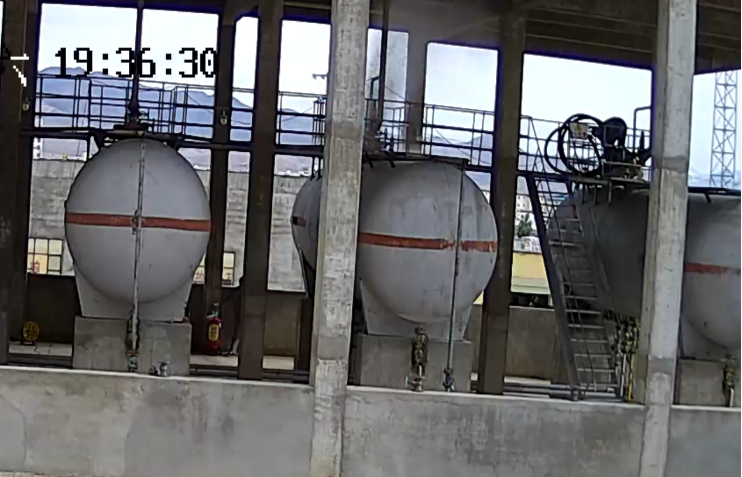 事故发生部位位于储罐区101、102储罐。现场踏勘时确认储罐接地装置、静电释放桩、工作楼梯、操作平台、注水阀、冷淋管、安全阀、排空阀、温度计、液位仪、紧急切断装置和可燃气体报警装置、灭火器均配置到位。监控视频装置位于储罐区外围围墙上。