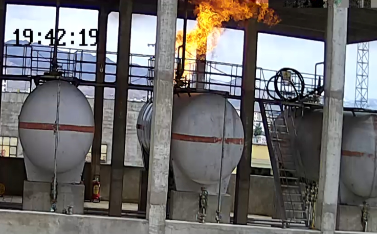 当冯某关停消防水泵返回现场时(2022年7月23日19时39分27秒),101储罐顶部发生闪燃,接连102储罐顶部产生爆燃,火焰瞬间升至储罐区上空建筑物顶部。