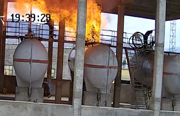 当冯某关停消防水泵返回现场时(2022年7月23日19时39分27秒),101储罐顶部发生闪燃,接连102储罐顶部产生爆燃,火焰瞬间升至储罐区上空建筑物顶部。